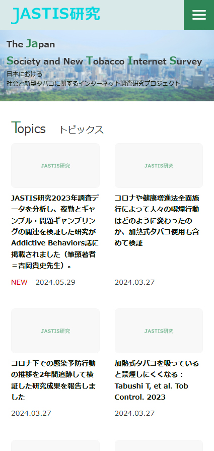 The Japan “Society and New Tobacco” Internet Survey (JASTIS) 研究プロジェクトは、 日本における新型タバコの使用状況や規制のルール、健康影響等について実態把握することを目的としたインターネット縦断調査研究プロジェクトです。
